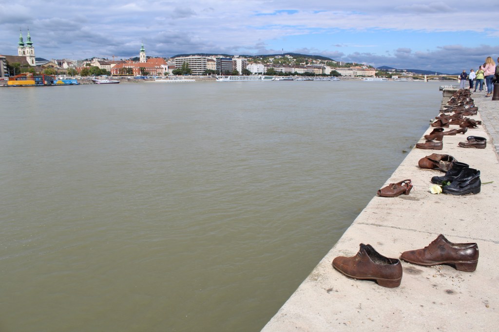 De iconische schoenen langs de Donau. Op deze plek zijn over een lengte van veertig meter, zestig paar metalen schoenen te vinden die op de rand van de kade staan. Deze schoenen werden er geplaatst ter nagedachtenis aan de Joden die gedood zijn op de oever wegens het nazi-regime. De Joden werden eerst gedwongen om hun schoenen uit te trekken en vervolgens op de rand van de kade te gaan staan, waarna ze doodgeschoten werden. Ze kregen niet eens een graf, want hun lijken werden door de stroming van de rivier meegenomen. Het is niet enkel een mooie plaats om te bezoeken, maar ook een plaats met een symbolische waarde.